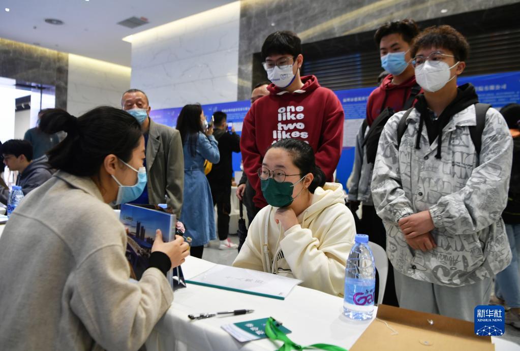 4月7日,在招聘會(huì )現場(chǎng),高校畢業(yè)生向用人單位人事負責人咨詢(xún)崗位情況。