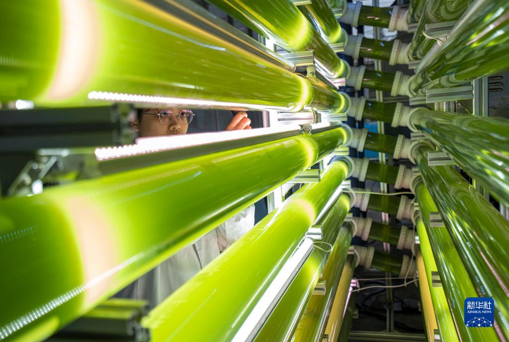 4月7日,在位于浙江省溫州市龍灣區圍墾南片的永興對蝦“未來(lái)漁場(chǎng)”,技術(shù)人員在藻類(lèi)連續培養系統前測量光照強度。