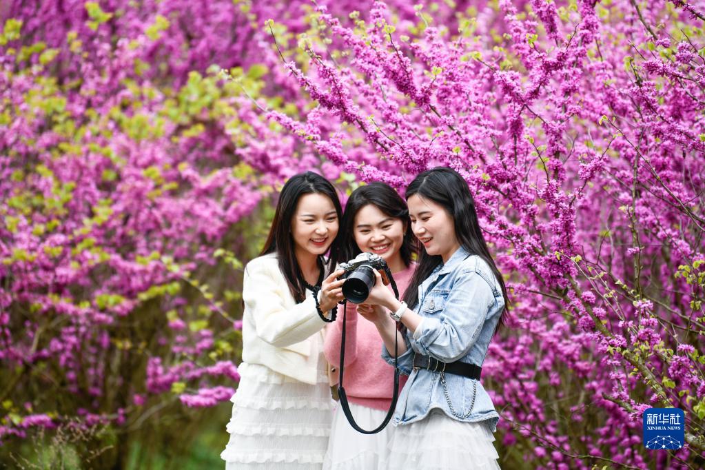 4月7日,游人在貴州省岑鞏縣天馬鎮玉門(mén)洞景區的紫荊花園賞花拍照。