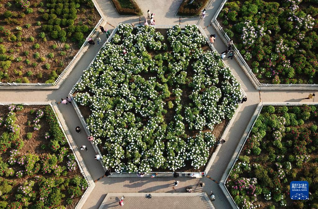 4月7日,在山東省菏澤市牡丹區的曹州牡丹園,游客在觀(guān)賞牡丹花(無(wú)人機照片)。
