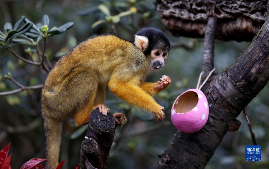 4月5日,在英國倫敦動(dòng)物園,一只松鼠猴享用“彩蛋大餐”。