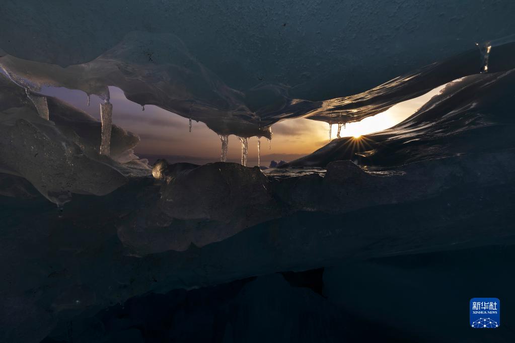 4月6日,賽里木湖畔的冰推在夕陽(yáng)下散發(fā)著(zhù)光芒。