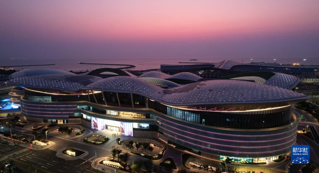 夜色中的??趪H免稅城(前)和??谛潞8劭瓦\綜合樞紐項目(后)(4月4日攝,無(wú)人機照片)。