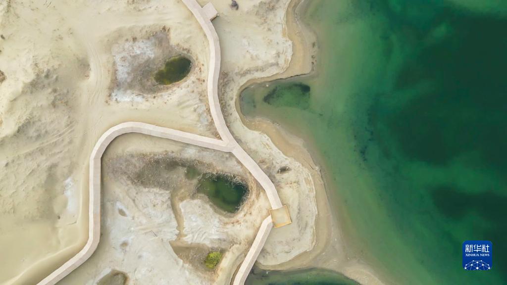 3月31日在羅布人村寨景區拍攝的神女湖(無(wú)人機照片)。
