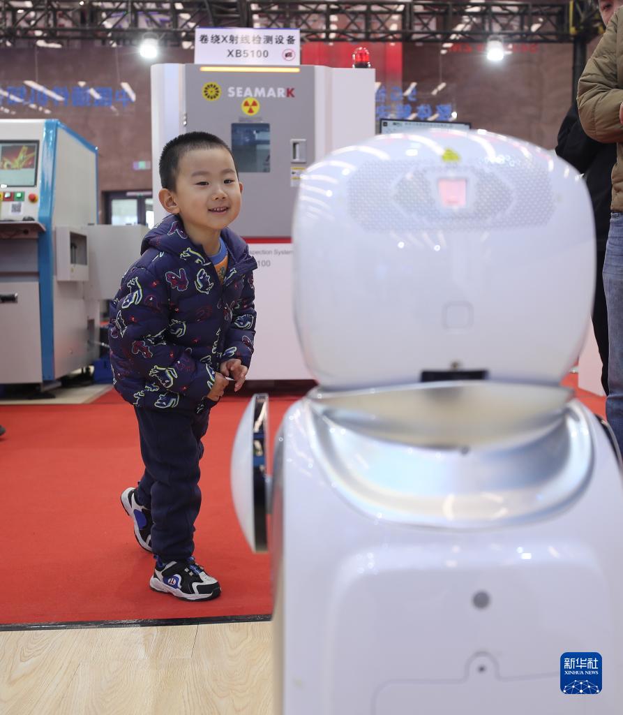 4月8日,小朋友在2023中國中小企業(yè)發(fā)展大會(huì )“專(zhuān)精特新”中小企業(yè)展覽會(huì )上參觀(guān)機器人。