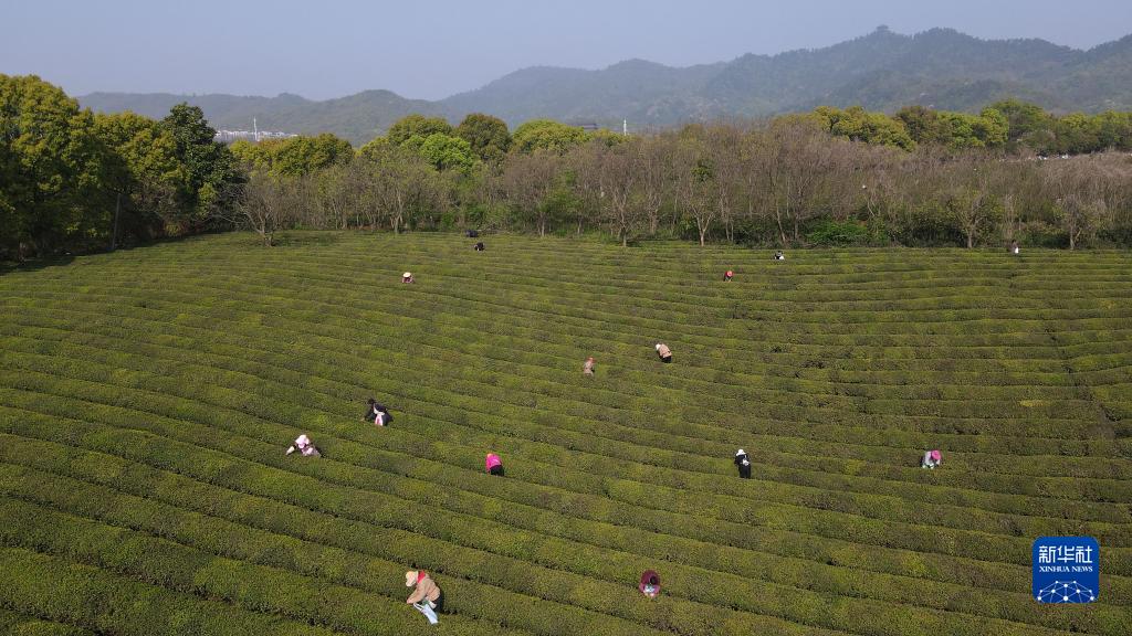 4月7日,采茶工在敬亭山山腳下的一處茶園里采茶,遠處是敬亭山(無(wú)人機照片)。