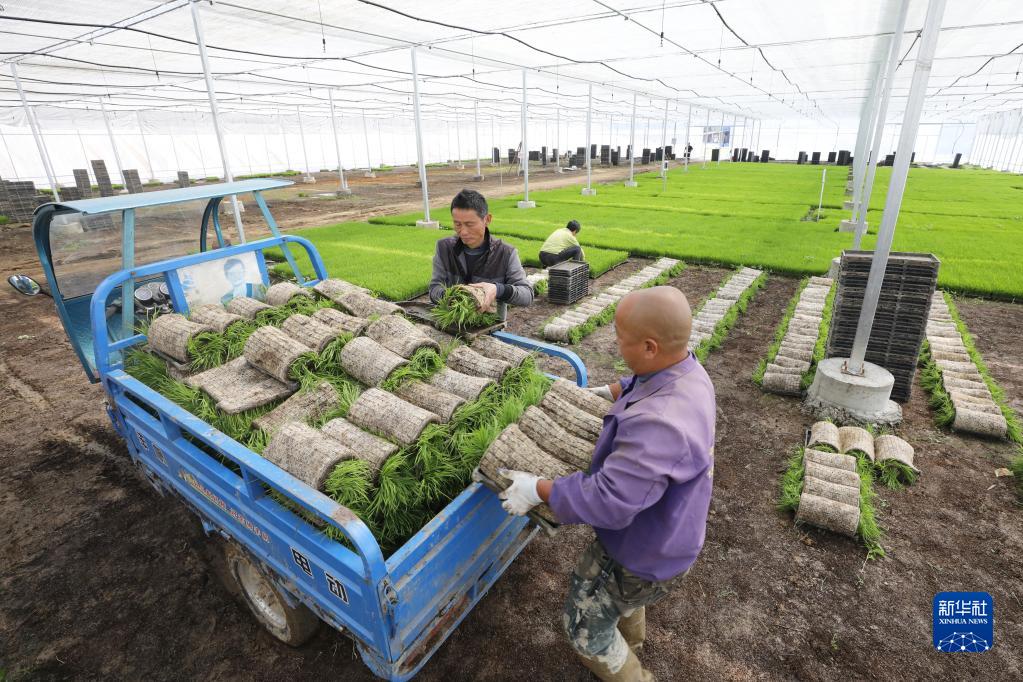 4月8日,在浦城縣石陂鎮申明村,浦城縣陳氏泰優(yōu)水稻專(zhuān)業(yè)合作社負責人陳兆武(左)與工人將再生稻秧苗裝車(chē)。