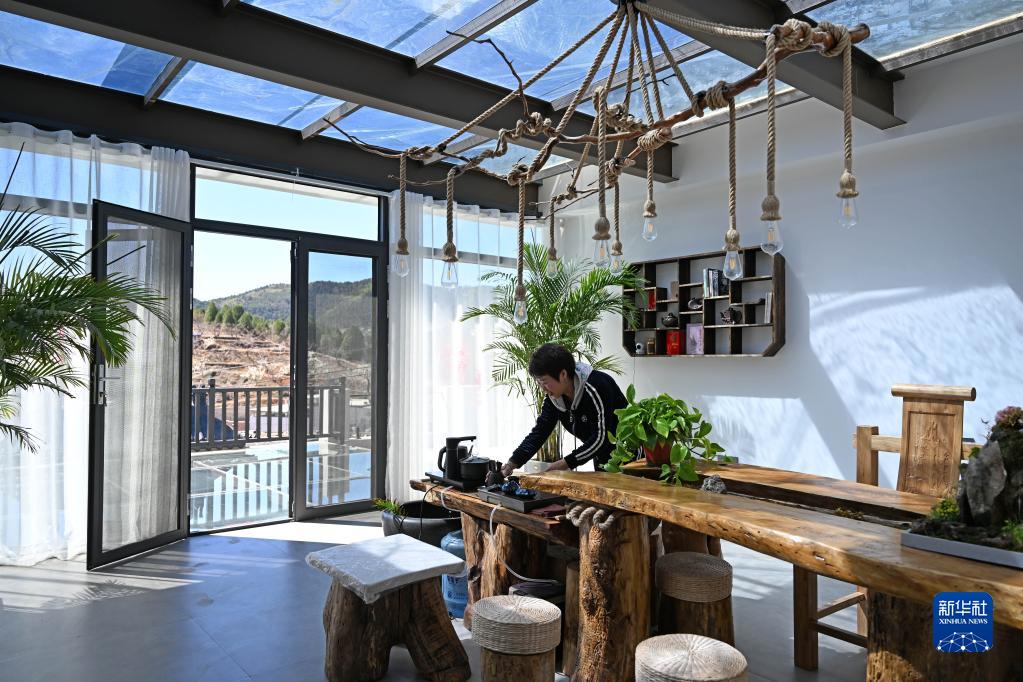 4月7日,天津市薊州區羅莊子鎮二十里鋪村一家民宿的負責人在整理茶具。