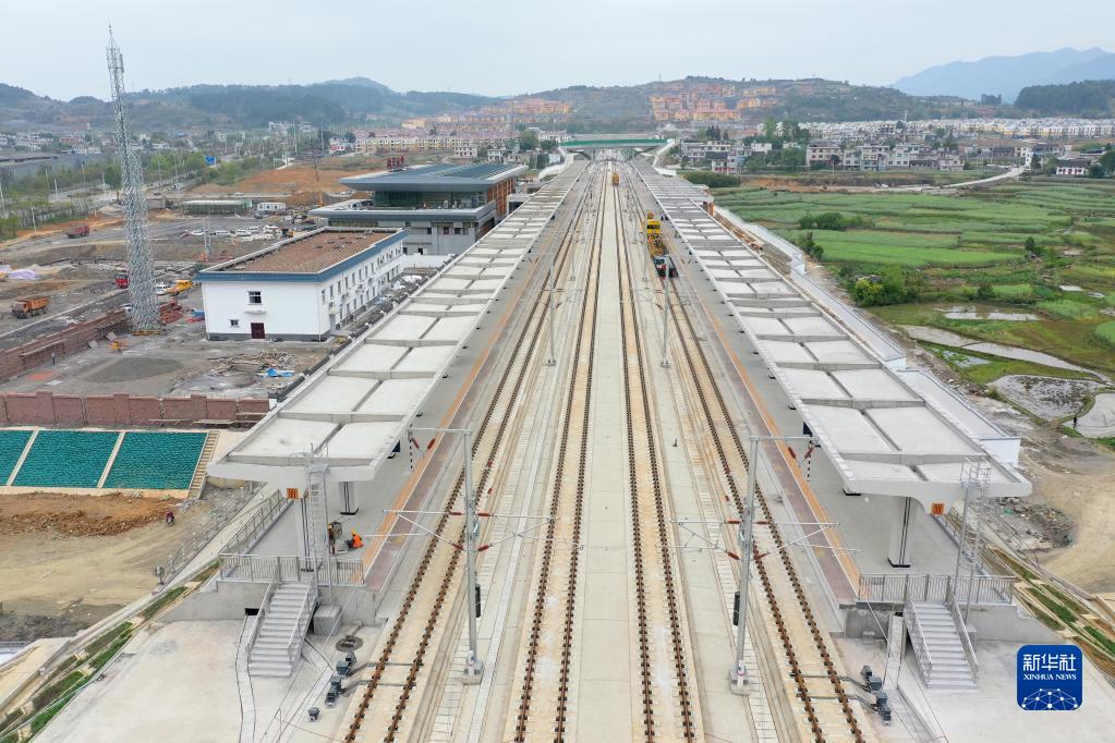 4月9日,獨山東站在緊張施工當中(無(wú)人機照片)。