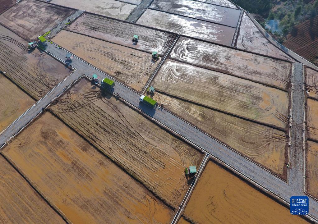 4月9日,浙江省武義縣大田鄉代石村的農民在田間插種早稻(無(wú)人機照片)。