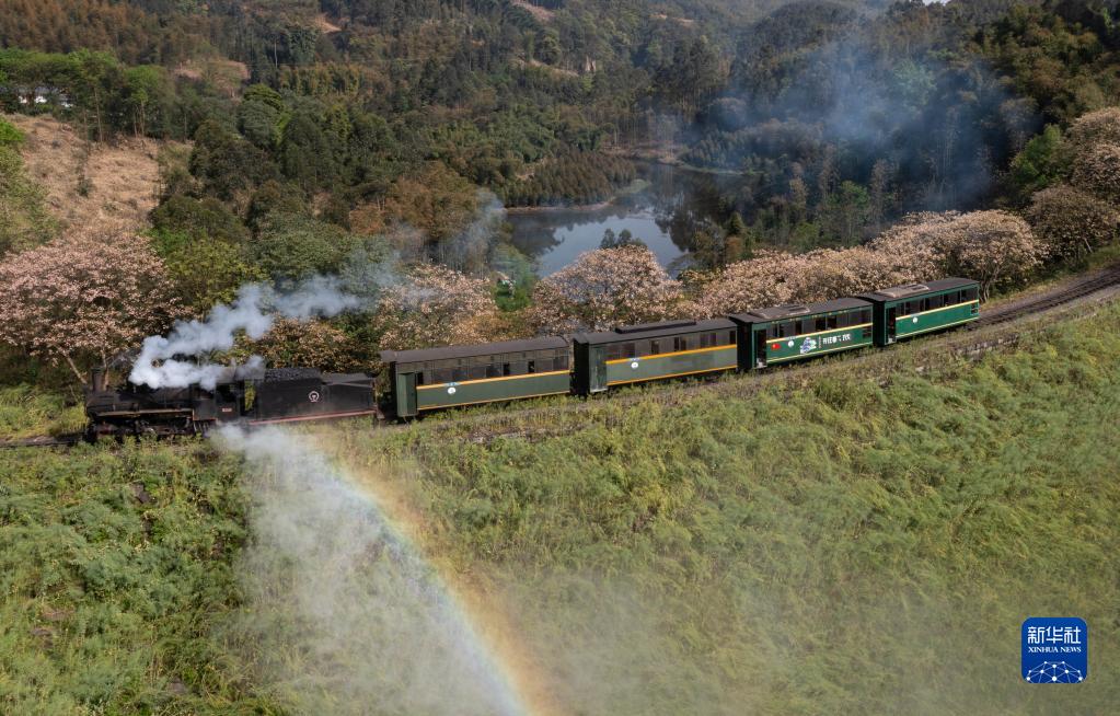 4月9日,一列嘉陽(yáng)小火車(chē)經(jīng)過(guò)亮水沱站的桐子花叢,噴出的蒸汽形成一道彩虹(無(wú)人機照片)。