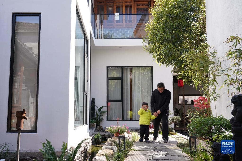 4月9日,游客在黟縣宏村的一家民宿庭院中休閑。