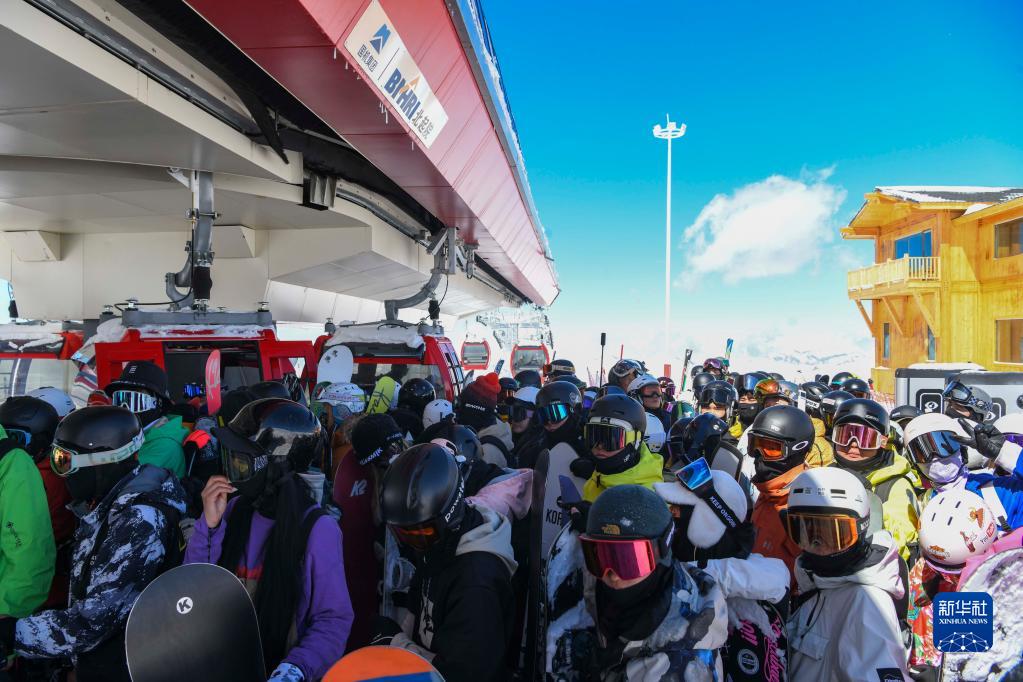 游客在新疆富蘊縣可可托海國際滑雪度假區排隊等候乘坐纜車(chē)(4月9日攝)。