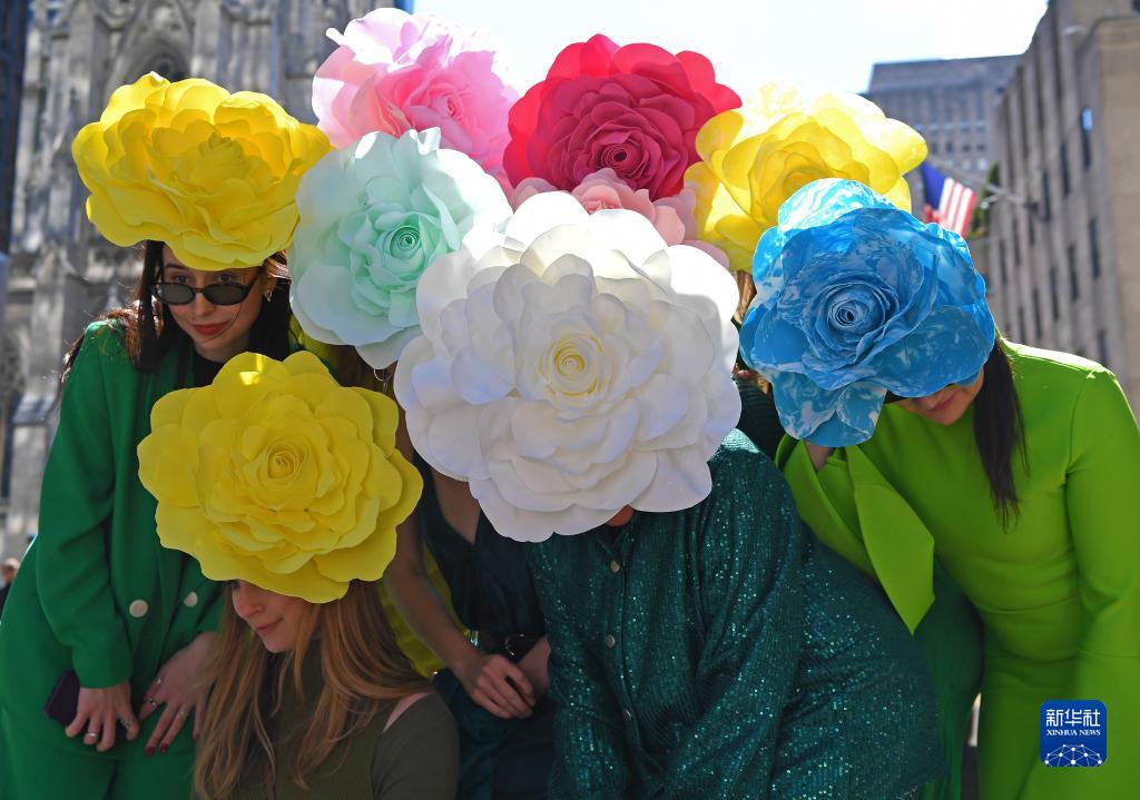 當日是西方傳統節日復活節,人們頭戴精心制作的花帽,在紐約第五大道參加一年一度的復活節游行。
