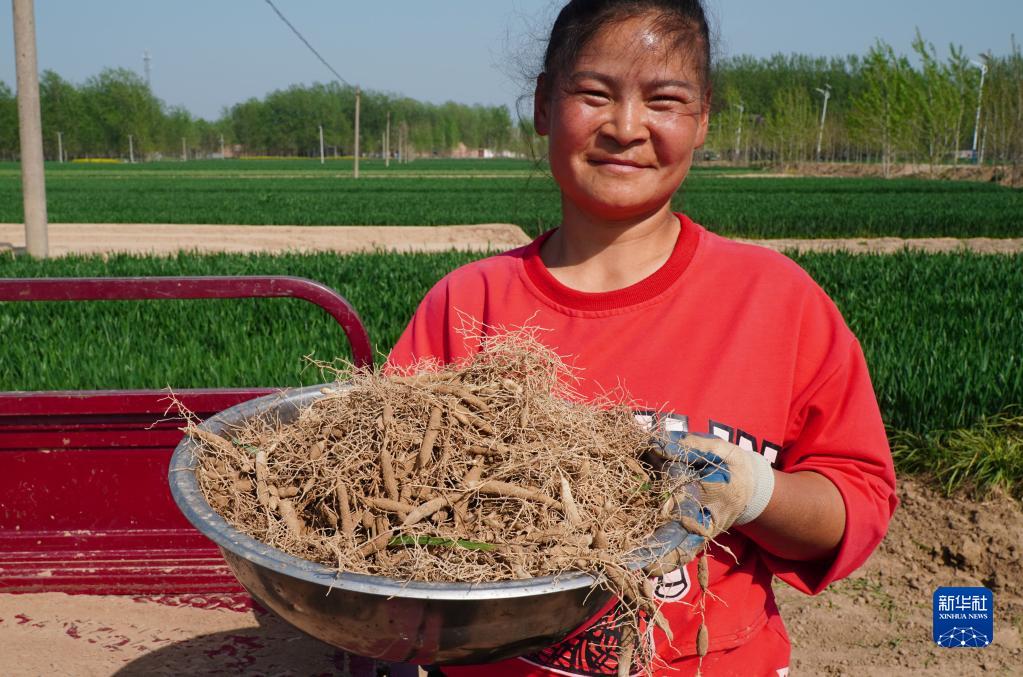 4月10日,在山東省單縣高老家鄉,一名麥冬種植戶(hù)在展示剛收獲的麥冬。
