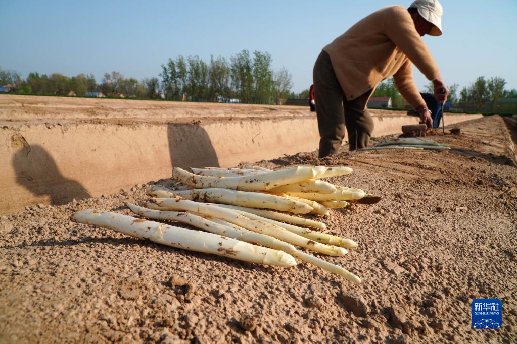 4月10日,在山東省單縣高老家鄉,村民在蘆筍種植田收獲蘆筍。
