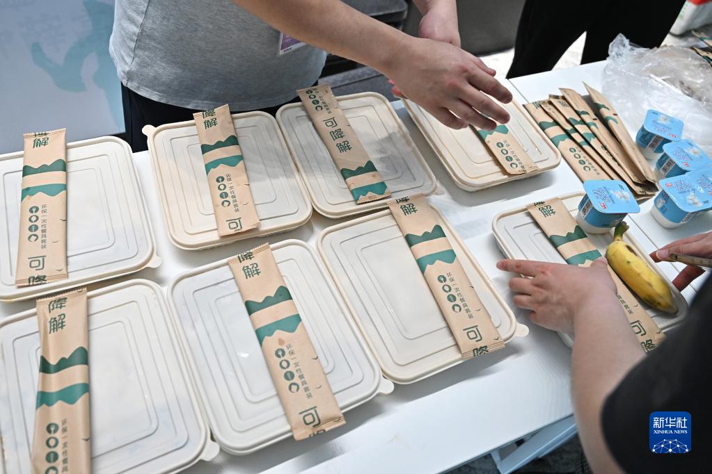 4月11日,在消博會(huì )就餐區,與會(huì )者領(lǐng)取用可降解餐盒包裝的午餐。