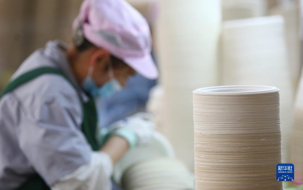 4月11日,在位于山東省滕州市西崗鎮的一家企業(yè),工人對以秸稈為原料生產(chǎn)的可降解餐盤(pán)進(jìn)行出廠(chǎng)前的質(zhì)量終檢。