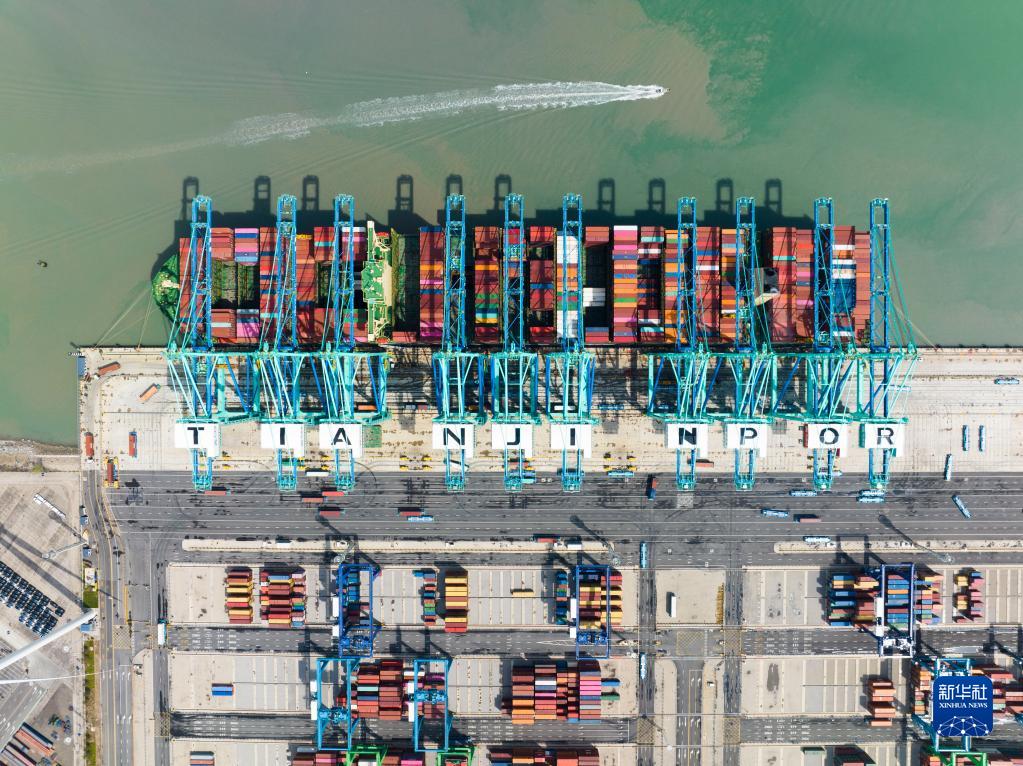 一艘貨輪靠泊在天津港“智慧零碳”碼頭進(jìn)行裝卸作業(yè)(4月6日攝,無(wú)人機照片)。
