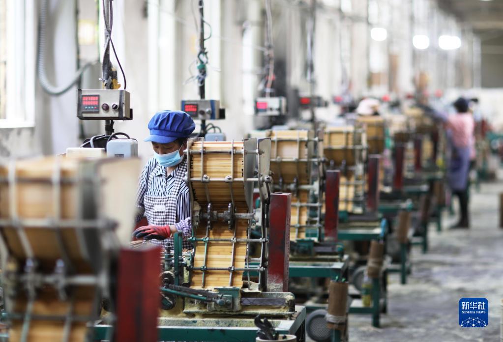 4月11日,在赤水市一家竹制品企業(yè),工人在流水線(xiàn)上作業(yè)。