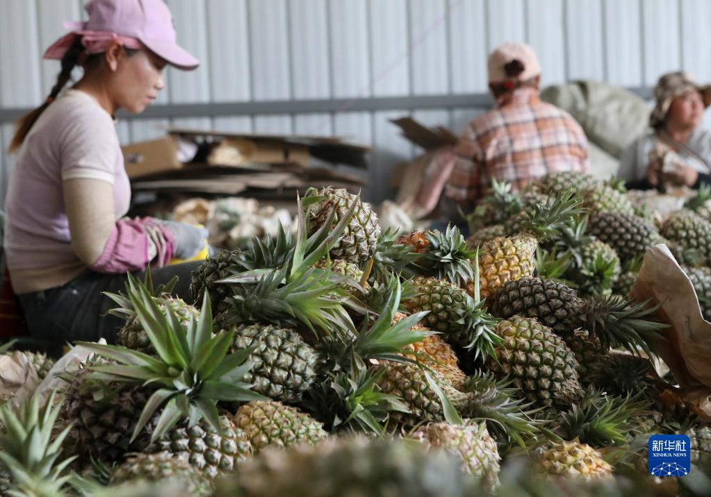 近日,云南省西雙版納傣族自治州景洪市鳳梨種植基地的鳳梨成熟,工人忙著(zhù)采摘、分揀、裝箱銷(xiāo)往市場(chǎng)。近年來(lái),景洪市因地制宜引進(jìn)鳳梨種植企業(yè),豐富熱帶水果品種,帶動(dòng)當地農民增收。