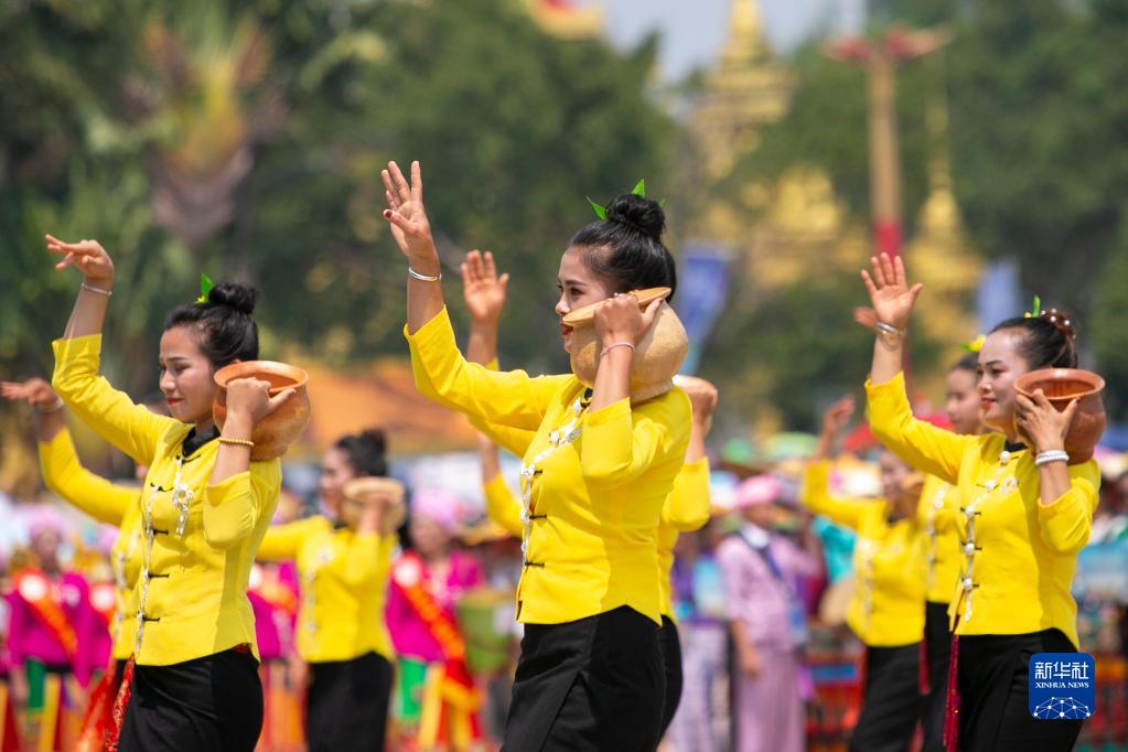 4月12日,表演者在芒市潑水節開(kāi)幕式上進(jìn)行非遺項目展演。