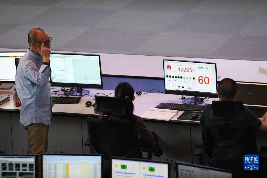 4月12日,EAST物理實(shí)驗總負責人龔先祖(左一)在實(shí)驗過(guò)程中與同事交流。