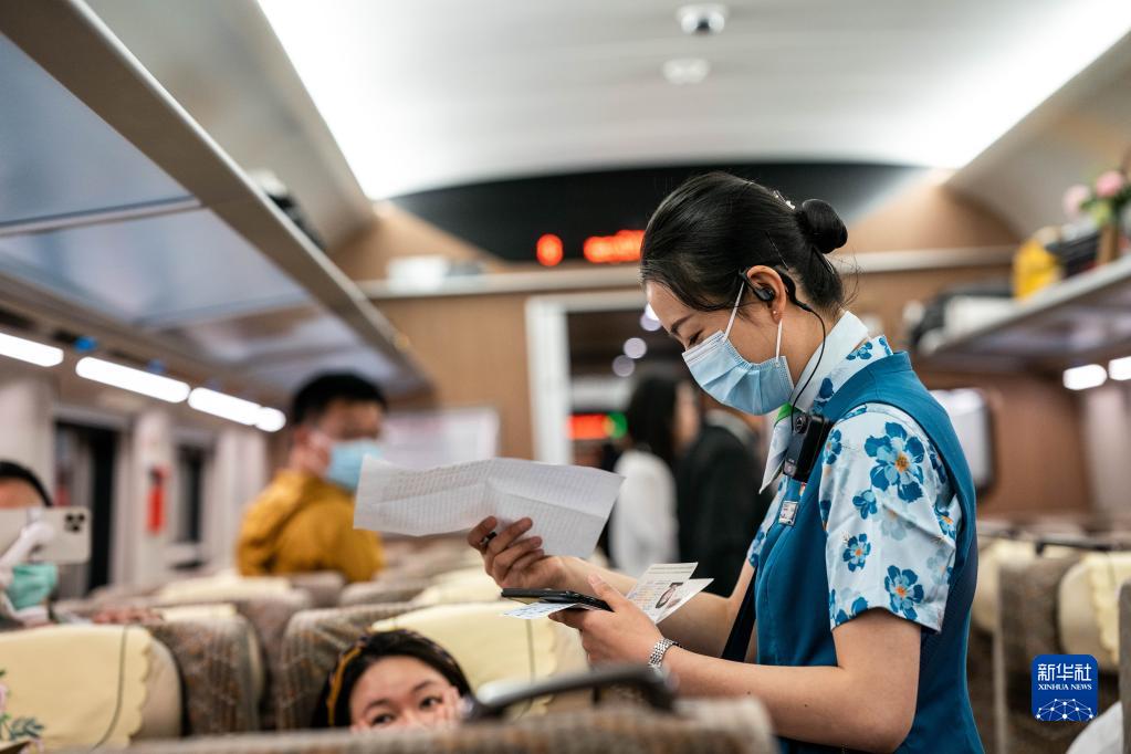 4月13日,首發(fā)列車(chē)乘務(wù)員在列車(chē)上查驗車(chē)票。