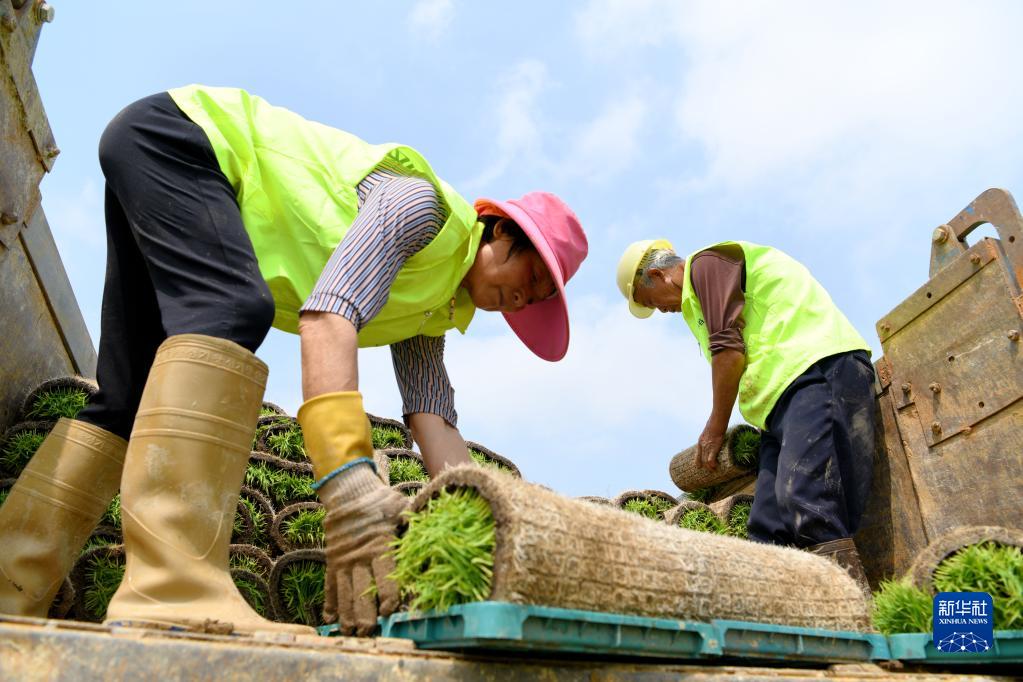 4月12日,在江西南昌縣涇口鄉育秧基地,工作人員將即將移栽大田的秧盤(pán)裝車(chē)。