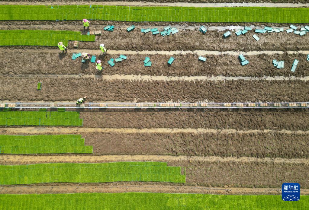 4月12日,在江西南昌縣涇口鄉育秧基地,工作人員轉運即將移栽大田的秧盤(pán)(無(wú)人機照片)。