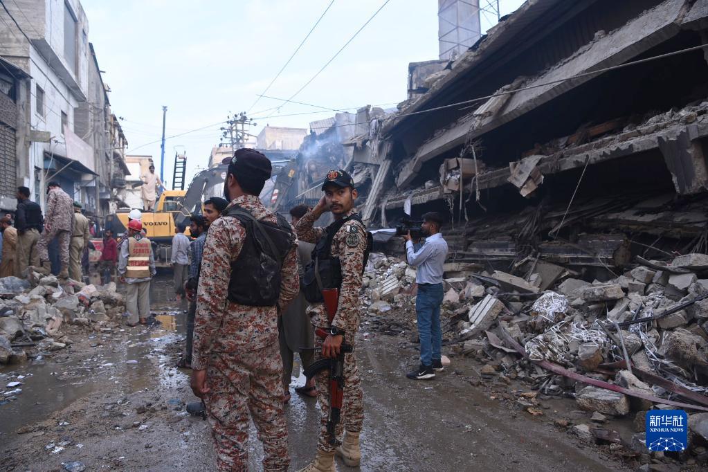 4月13日,在巴基斯坦卡拉奇,救援人員清理因火災坍塌的工廠(chǎng)廢墟。