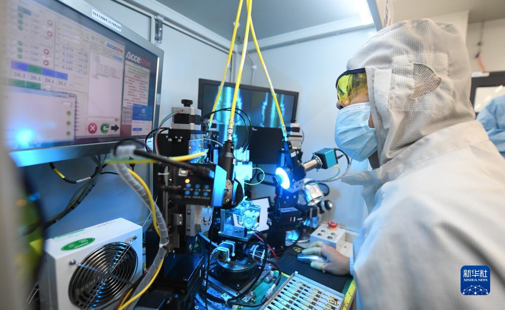 技術(shù)人員在光模塊生產(chǎn)線(xiàn)作業(yè)(4月11日攝)。