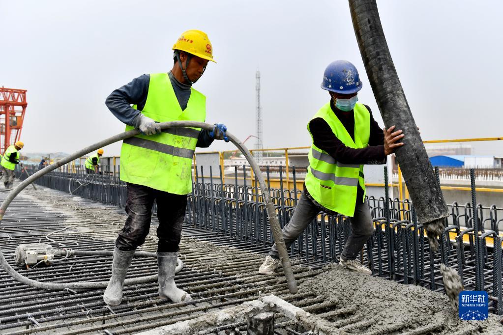 4月13日,在濟鄭高鐵中鐵十局濟南西制梁場(chǎng),中鐵十局的工作人員在澆筑箱梁。