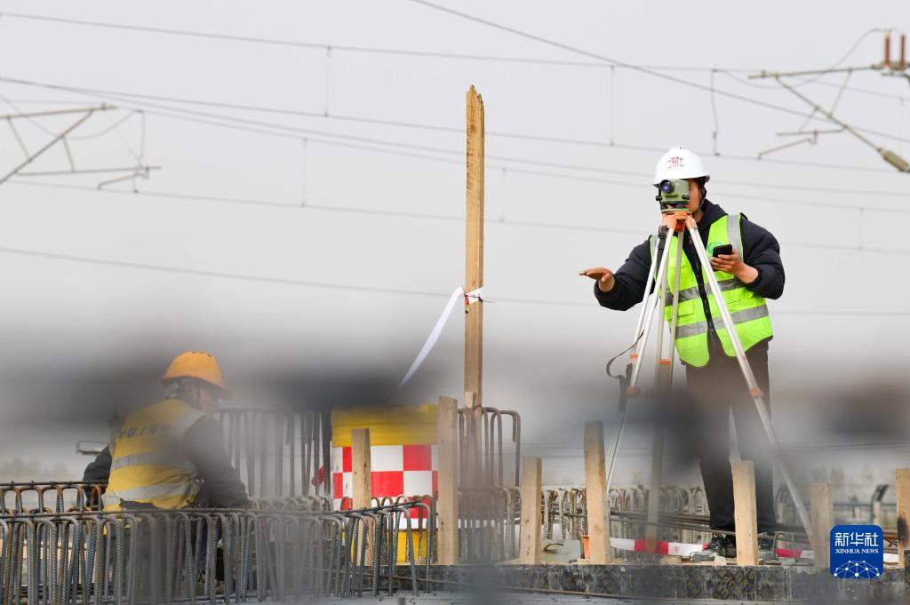 4月13日,工人在包銀高鐵包頭段首座有砟軌道鋼筋混凝土剛構連續梁建設現場(chǎng)作業(yè)。