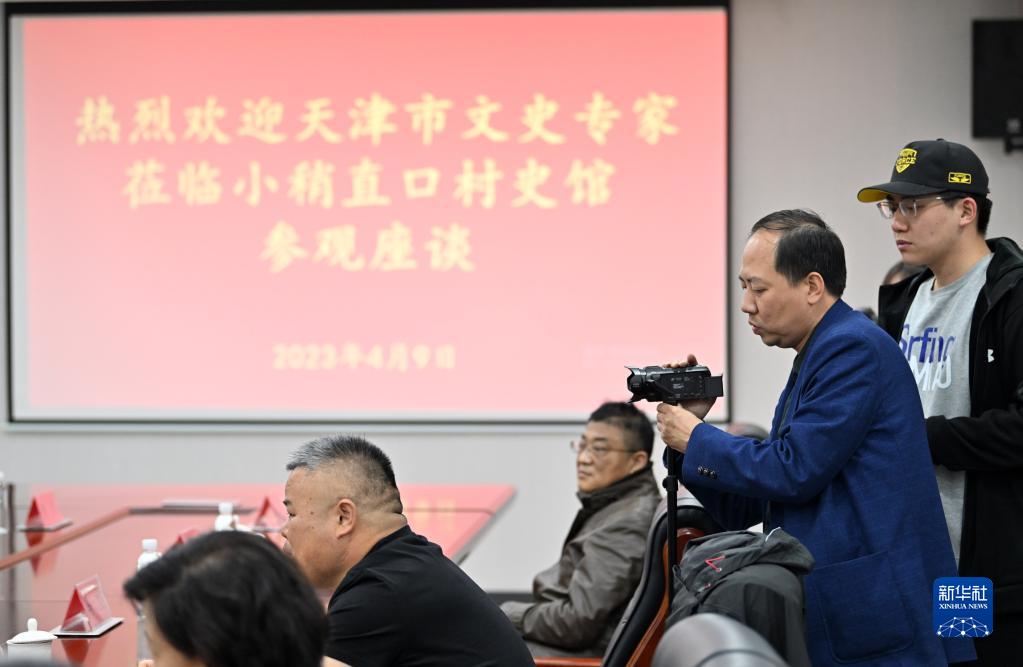 在天津市西青區小稍直口村史館,謝連華手拿攝像機記錄專(zhuān)家發(fā)言(4月9日攝)。
