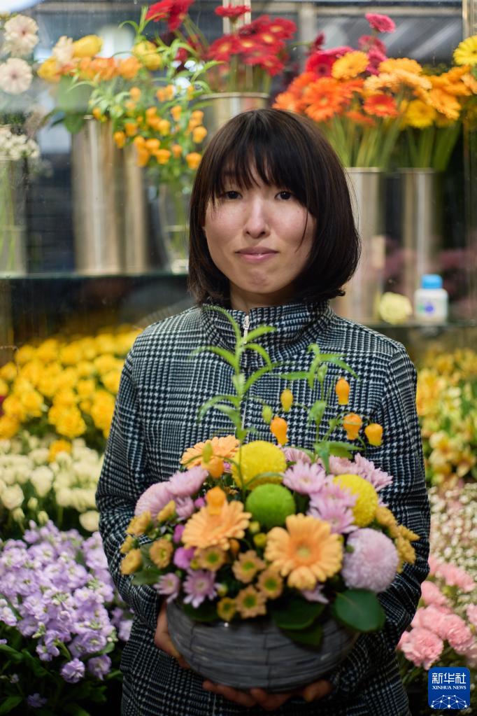 在日本千葉縣千葉市,花店店員產(chǎn)方美希展示店內出售的花藍。制作花籃的鮮花部分源自中國云南(4月3日攝)。