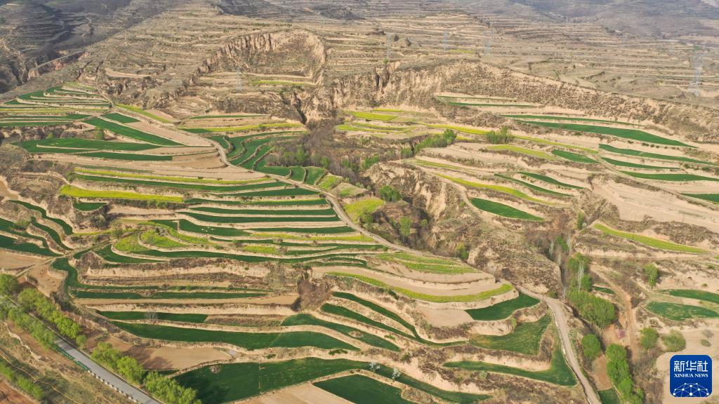 這是4月13日拍攝的甘肅省平?jīng)鍪谐缧趴h錦屏鎮境內的梯田(無(wú)人機照片)。
