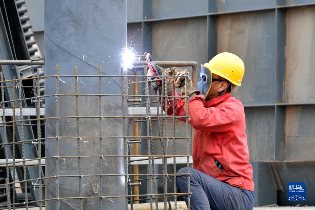 4月13日,工人在位于張掖市甘州區的20萬(wàn)噸硅系新材料綜合利用項目建設現場(chǎng)施工。