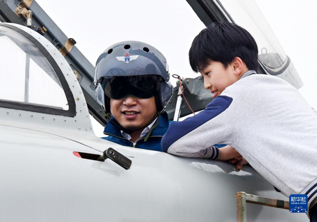 4月14日,一名參加研學(xué)活動(dòng)的男孩(右)與青島海洋軍事博物館工作人員交流。