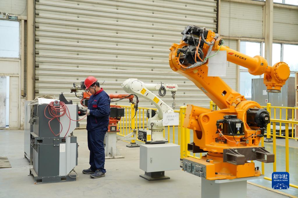 4月14日,工人在唐山賀祥智能科技股份有限公司車(chē)間調試機器人產(chǎn)品。