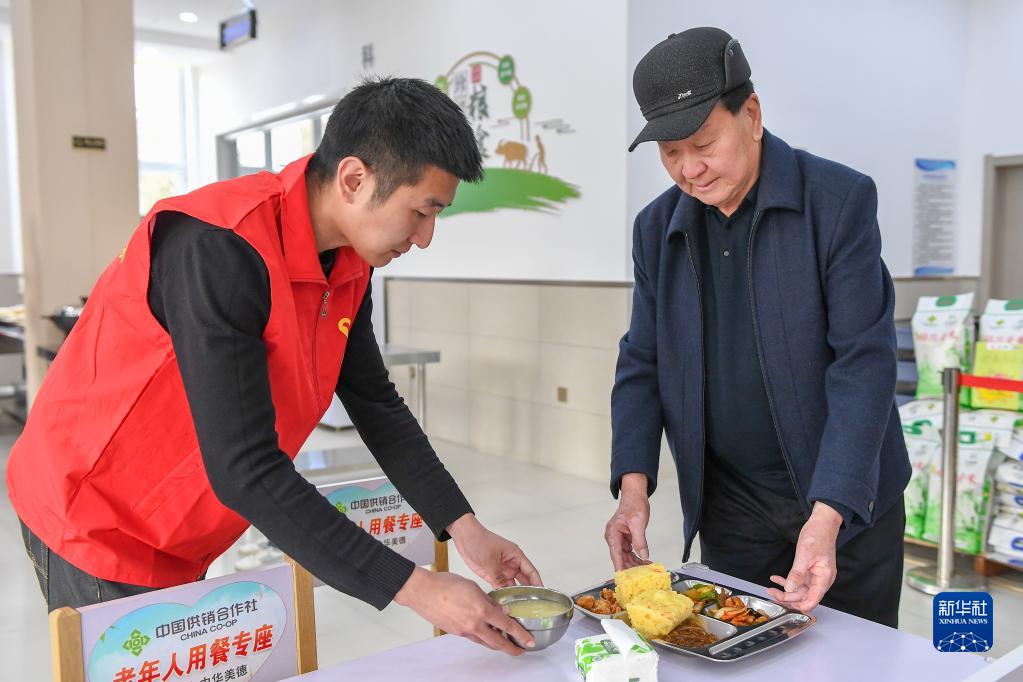 4月14日,在吉林省四平市梨樹(shù)縣幸福社區食堂,志愿者為老人端菜。該食堂是吉林省民政廳重點(diǎn)支持的100個(gè)社區老年食堂之一。