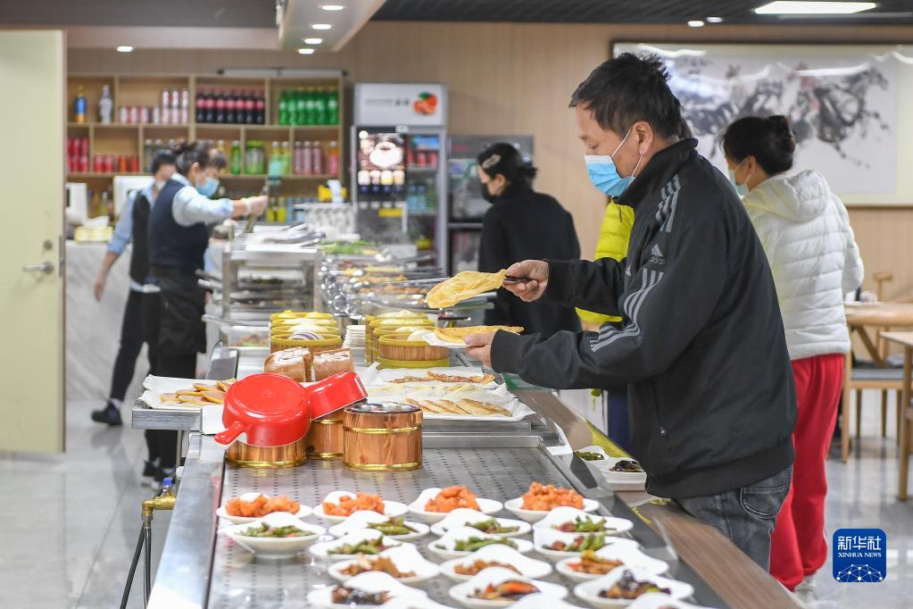 4月11日,在吉林省長(cháng)春市朝陽(yáng)區光明社區食堂,市民在挑選菜品。該食堂是吉林省民政廳重點(diǎn)支持的100個(gè)社區老年食堂之一。