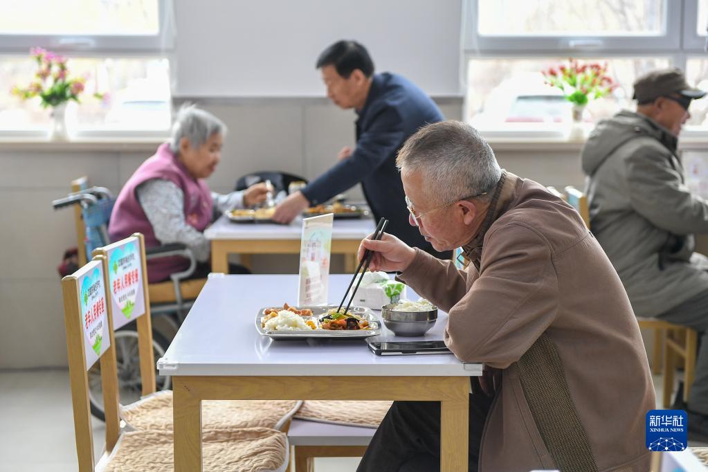 4月14日,老人在吉林省四平市梨樹(shù)縣幸福社區食堂就餐。該食堂是吉林省民政廳重點(diǎn)支持的100個(gè)社區老年食堂之一。
