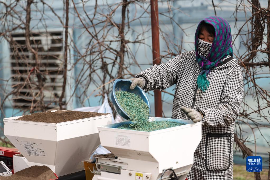 4月14日,盤(pán)錦市盤(pán)山縣的農戶(hù)在進(jìn)行水稻秧苗育苗工作。