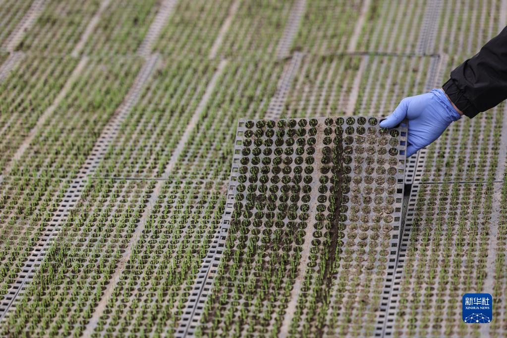 4月14日,盤(pán)錦市盤(pán)山縣的農戶(hù)在查看水稻秧苗的育苗情況。