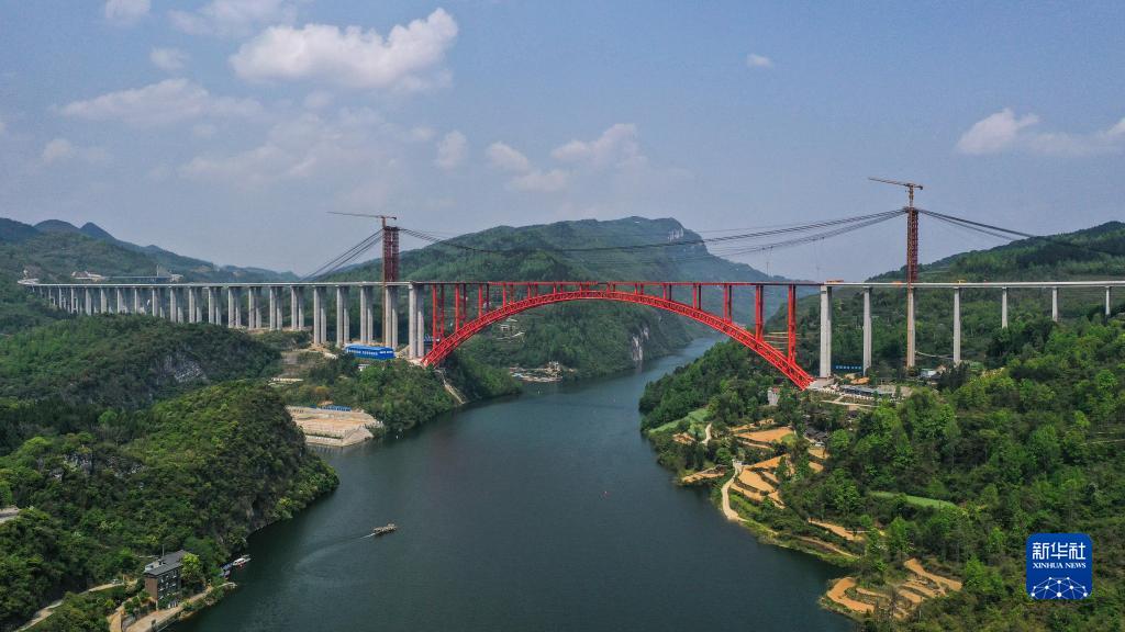 4月11日拍攝的貴州德余高速烏江特大橋建設現場(chǎng)(無(wú)人機照片)。