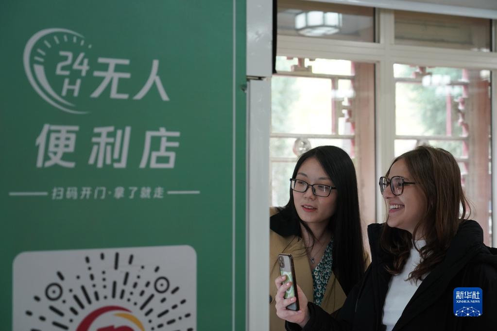 4月13日,微微(右)在北京大學(xué)燕京學(xué)堂,掃碼購買(mǎi)商品。