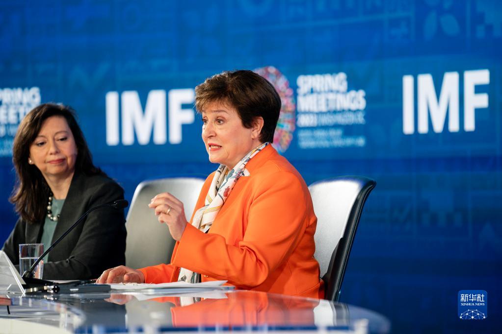 4月13日,在美國華盛頓,國際貨幣基金組織(IMF)總裁格奧爾基耶娃(右)出席記者會(huì )。