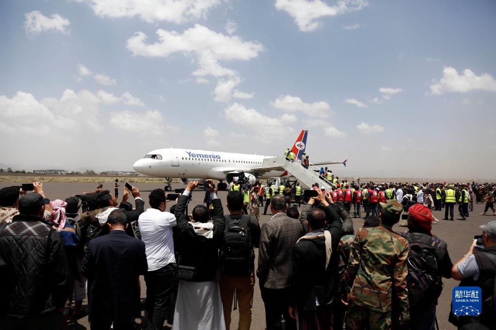 4月14日,搭載獲釋胡塞武裝成員戰俘的飛機抵達也門(mén)薩那機場(chǎng)。