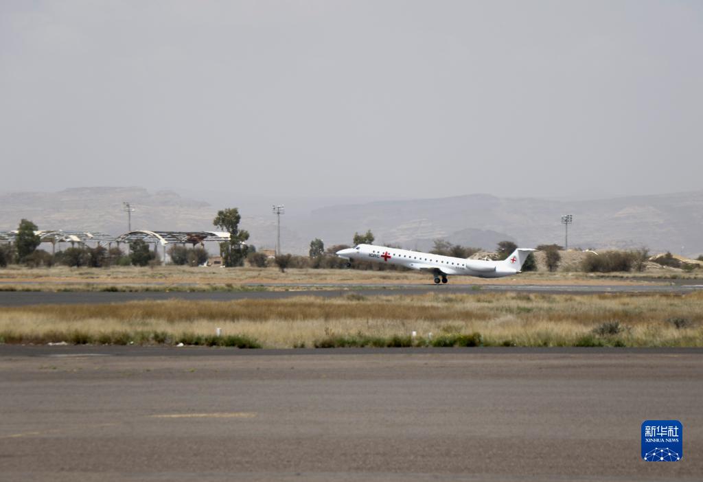 4月14日,搭載獲釋也門(mén)政府軍戰俘的飛機從也門(mén)薩那機場(chǎng)起飛,前往亞丁。